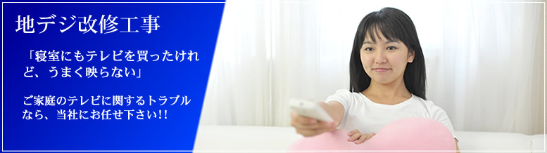 地デジを受信するためにはUHFアンテナが必要となります。従来の受信設備をそのまま利用して受信できるケースもありますが、受信状況によってはアンテナやブースターの改修工事が必要になります。特にご家庭では、ハードディスクレコーダーやテレビの台数が多い場合には屋内の配線等を効率良く設置しませんと、「特定の部屋のテレビだけ映りが悪い」などの問題が起きてしまいます。